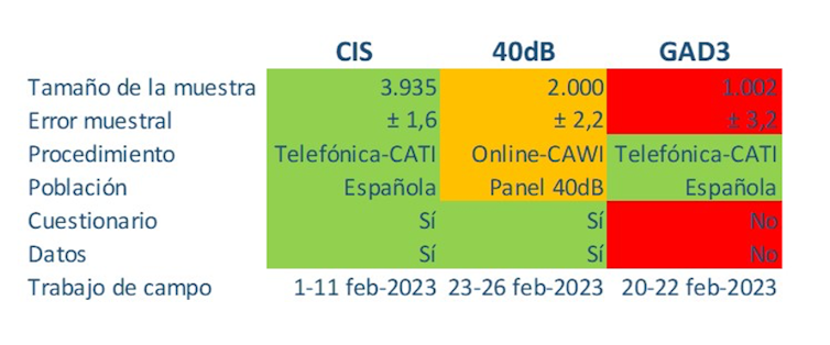 Para asegurar que una encuesta tiene validez (mide lo que dice medir) y fiabilidad (lo mide bien) hay que fijarse en el tamaño de la muestra y en cómo se ha obtenido. De todas las que se habla en los medios de comunicación, solo tres proporcionan esta información: la del CIS (Centro de Investigaciones Sociológicas), la de 40dB para El País y la de GAD3 para el digital NIUS y el grupo Mediaset. En la imagen que sigue a este párrafo se comparan las tres.